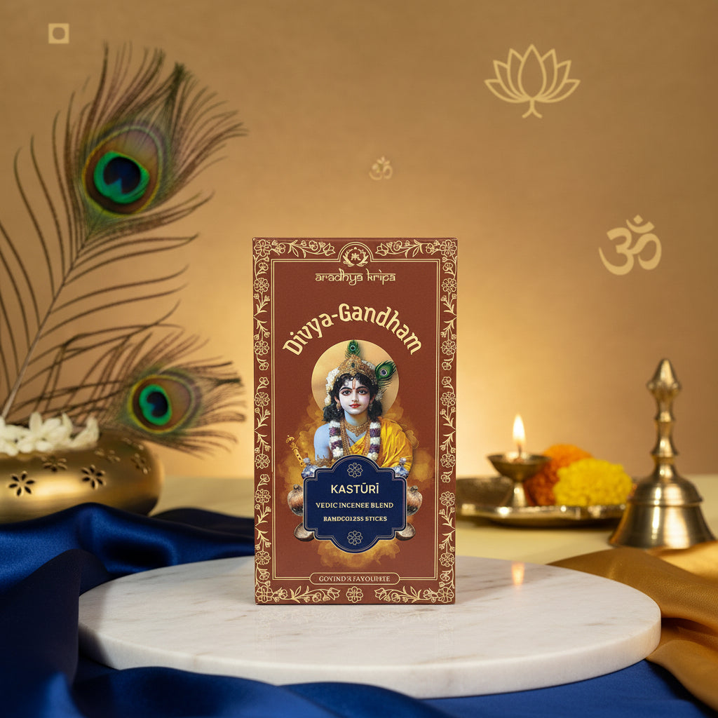 This famous śloka paints the divine picture of the Lord. “Upon His forehead (lalāta-patale) is the Kasturi-Tilakam (the mark of musk); upon his chest, the Kaustubha gem; on his nose a pearl, in his hand a flute, and on his wrist a bracelet.” And why Kasturi? Because this deep, devotional fragrance is named in the very first word of his description. It is the sacred scent of his shringāra (adornment). Offering this Kasturi fragrance is to meditate on his all-attractive form, the Gopala Choodamani (crest-jewel of the cowherds), and to feel his immediate, beloved presence.