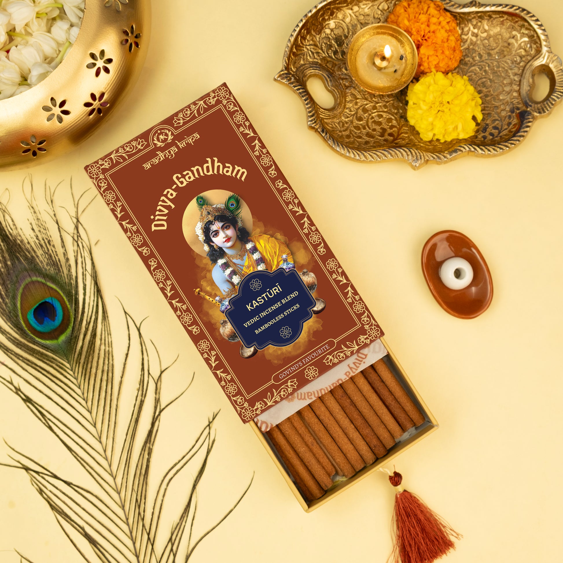 This sacred fragrance calms the devotee's mind, removes distractions, and aids focus for dhyāna (meditation) and japa.
